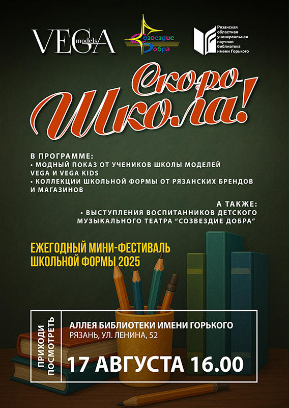 Модельное агентство VEGA MODELS и библиотека имени Горького приглашают на ежегодный мини-фестиваль школьной формы, который пройдет 17 августа.