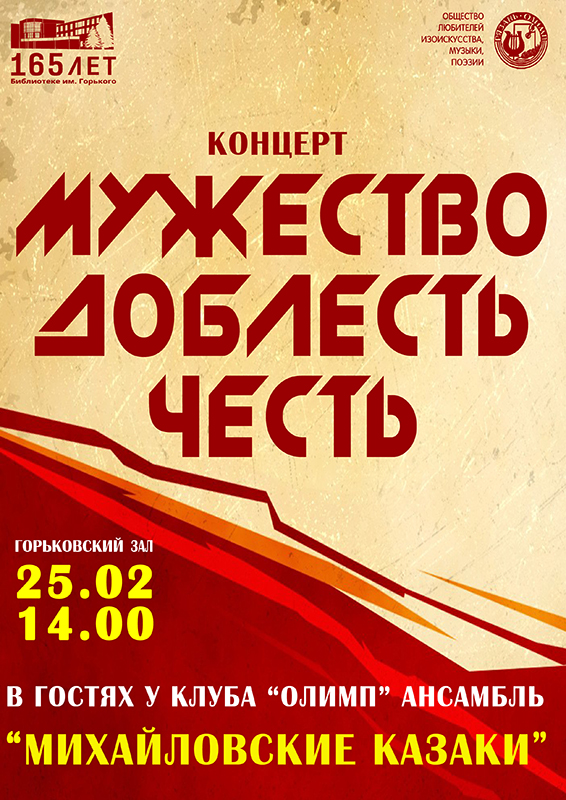 К Дню защитника Отечества в клубе «ОЛИМП» состоится концерт «Мужество. Доблесть. Честь», подготовленный ансамблем народной песни «Михайловские казаки» (художественный руководитель – Александр Воронин).