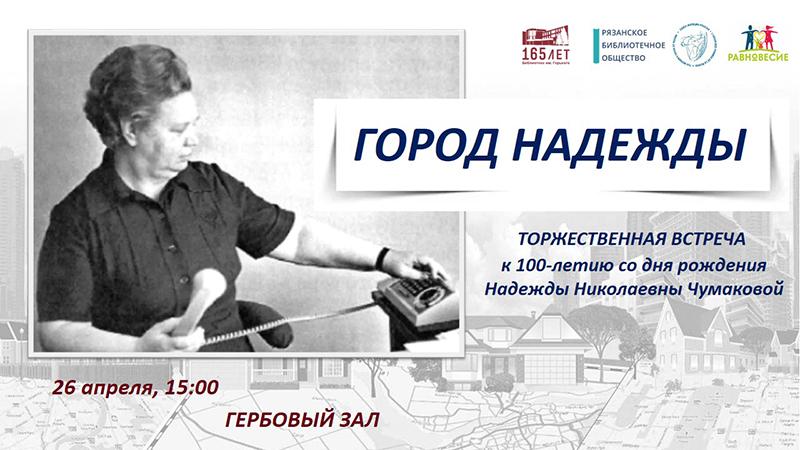 В канун 100-летия со дня рождения легендарного руководителя г. Рязани Надежды Николаевны Чумаковой 26 апреля в 15:00 в Гербовом зале областной библиотеки имени Горького пройдет торжественная встреча «Город Надежды».