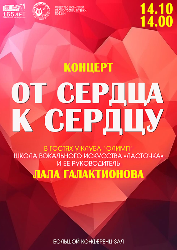 «От сердца к сердцу» – так назвала эту встречу основатель и руководитель школы вокала, наш замечательный партнер и друг библиотеки Лала Галактионова. И действительно, свое музыкальное призвание, мастерство певицы и вокального педагога она успешно передает своим ученикам, развивая в них творческие способности, открывая новые грани чарующего мира музыки. Лала представит творчество своих воспитанников и выступит вместе с ними. В концерте прозвучат песни известных советских композиторов.