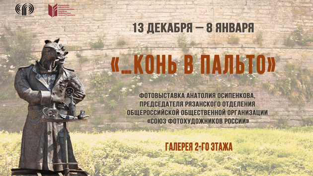 13 декабря в 17:00 в библиотеке имени Горького состоится открытие фотовыставки «…Конь в пальто» известного рязанского фотохудожника, председателя Рязанской областной организации Общероссийской общественной организации «Союз фотохудожников России» Анатолия Яковлевича Осипенкова. Выставка приурочена ко дню рождения мастера.
