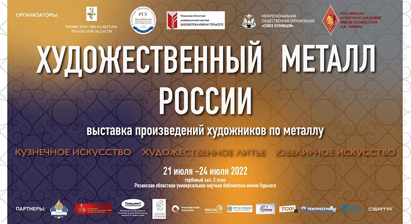 22 июля в 9.30 в Гербовом зале Рязанской областной универсальной научной библиотеки имени Горького состоится открытие выставки «Художественный металл России».