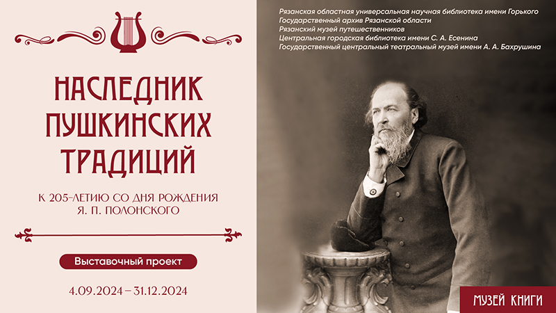 На выставке, посвященной 205-летию со дня рождения Якова Петровича Полонского, представлены прижизненные собрания сочинений, сборники произведений писателя, публикации прозы и стихотворений в журналах XIX в., рецензии, а также посмертные издания, в том числе выпущенные в свет на Рязанской земле, и другие материалы, знакомящие с постепенным становлением Полонского-писателя и раскрывающие значение поэта в истории русской литературы, культуры и общественной жизни Рязанского края и России.