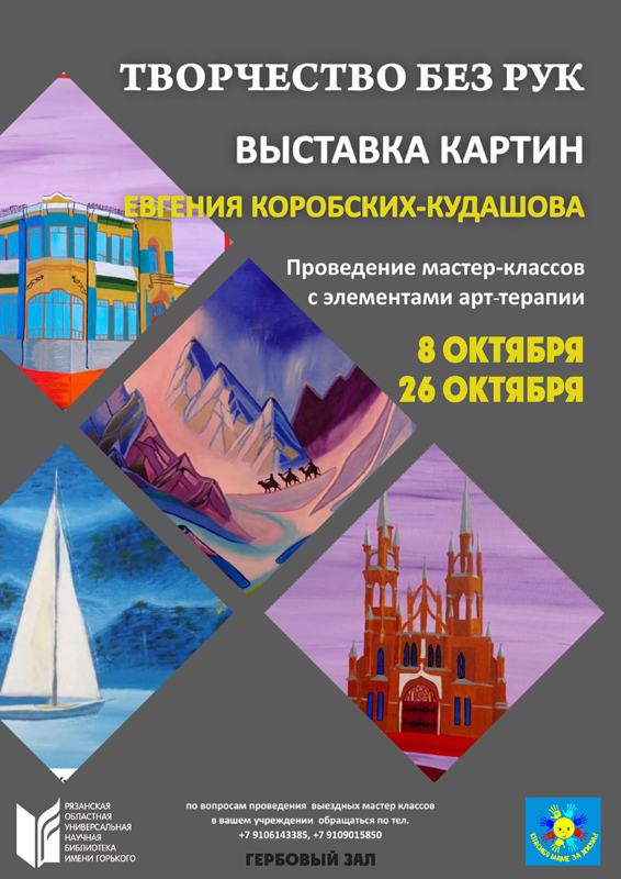 8 октября в 12:00 приглашаем всех любителей прекрасного в Гербовый зал на открытие выставки картин Евгения Коробских-Кудашова «Творчество без рук». Выставка организована Рязанской областной библиотекой имени Горького совместно с Благотворительным фондом «Спасибо маме за жизнь».