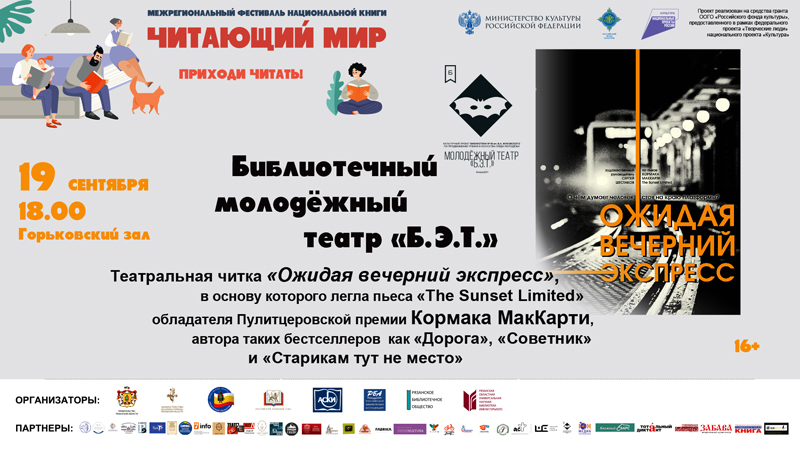19 сентября в 18.00 в Горьковском зале в рамках фестиваля «Читающий мир» пройдет театральная читка пьесы «Ожидая вечерний экспресс» обладателя Пулитцеровской премии Кормака Маккарти, автора бестселлеров «Дорога», «Кровавый меридиан», «Старикам тут не место».