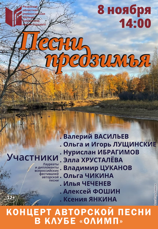 8 ноября в клубе «ОЛИМП» состоится традиционный осенний концерт авторской песни. Самые известные рязанские барды, поэты, композиторы, лауреаты и дипломанты российских фестивалей будут петь и читать свои стихотворения.