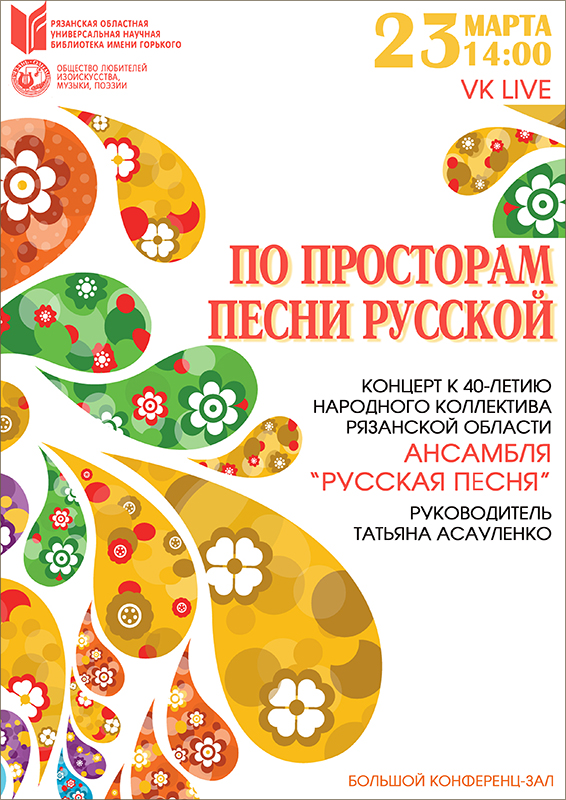 В клубе «ОЛИМП» пройдет концерт, приуроченный к 40-летнему юбилею Народного любительского художественного коллектива Рязанской области ансамбля «Русская песня» Дворца молодежи г. Рязани. Руководитель ансамбля – лауреат премии Рязанской области «За вклад в развитие и сохранение традиционной народной культуры Рязанской области» Татьяна Асауленко.