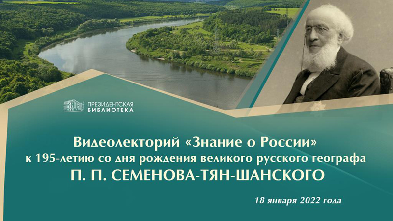 18 января 2022 года в 11:00 в рамках проекта «Знание о России» состоится видеолекторий, приуроченный к 195-летию со дня рождения великого русского учёного и географа Петра Петровича Семёнова-Тян-Шанского.