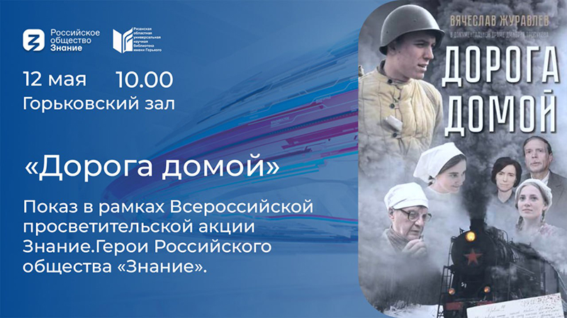 12 мая 2023 года в 10.00 в Горьковском зале Рязанской областной универсальной научной библиотеки имени Горького состоится показ фильма «Дорога домой» для учащихся 10-х классов Ордена «Знак Почета» гимназии № 2 имени И. П. Павлова с участием съемочной группы и актеров. Показ пройдет в рамках Всероссийской просветительской акции Знание.Герои Российского общества «Знание».