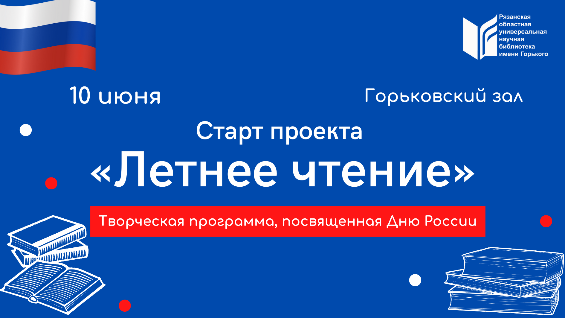 10 июня в библиотеке им. Горького будет дан старт новому сетевому проекту «Летнее чтение», который библиотека имени Горького реализует совместно с министерством культуры Рязанской области, Рязанским библиотечным обществом, Рязанским областным Советом женщин, волонтерами культуры и библиотеками региона.