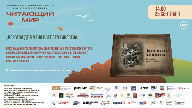 В рамках Межрегионального фестиваля национальной книги «Читающий мир» состоится презентация книги директора Музея академика И.И. Срезневского в Рязанском государственном университете имени С.А. Есенина, заслуженного учителя РФ Нины Васильевны Колгушкиной.