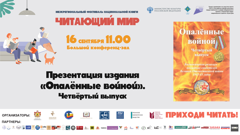 В рамках фестиваля «Читающий мир» 16 сентября в 11.00 состоится презентация IV выпуска книги «Опаленные войной. Воспоминания рязанцев – последних свидетелей Великой Отечественной войны 1941 – 1945 гг.». Руководитель проекта – председатель правления Рязанского регионального отделения Общероссийской общественной организации «Дети войны» Евгений Евдокимович Константинов.