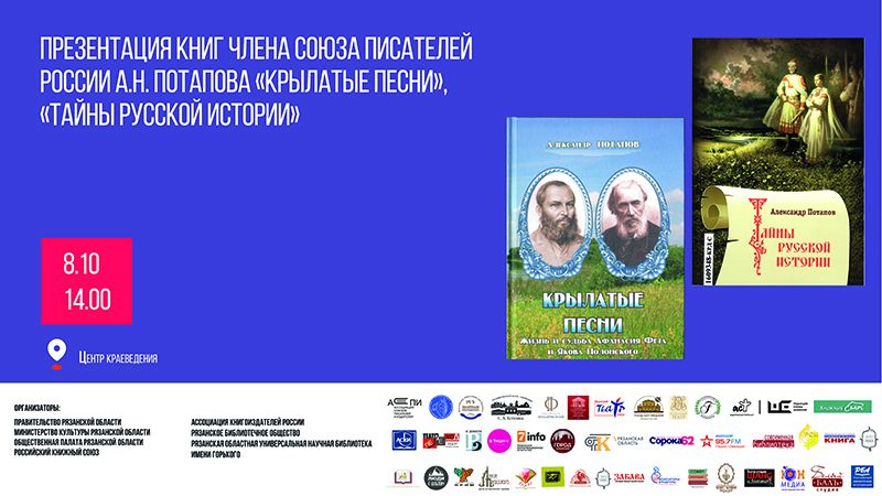 В рамках межрегионального фестиваля национальной книги «Читающий мир» состоится презентация книг краеведческих очерков Александра Николаевича Потапова «Крылатые песни» и «Тайны русской истории».