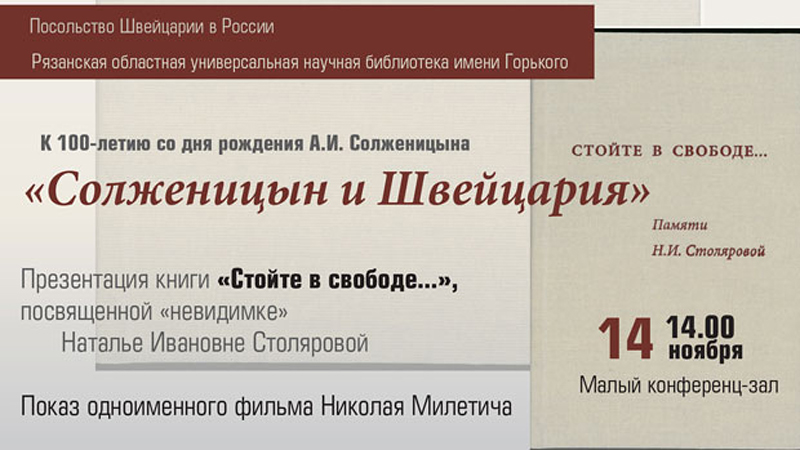 14 ноября в 14.00 в рамках продолжающегося сотрудничества библиотеки им. Горького с посольством Швейцарии в России и реализации проекта «Солженицын и Швейцария», посвященного 100-летию со дня рождения А.И. Солженицына, состоится презентация книги «Стойте в свободе…».