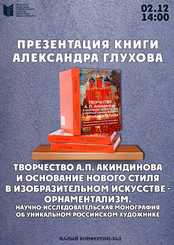 2 декабря в Рязанской областной универсальной научной библиотеке имени Горького состоится презентация книги известного московского историка, писателя, художника, искусствоведа, члена и лектора Российского общества «Знание» Александра Глухова «Творчество А.П. Акиндинова и основание нового стиля в изобразительном искусстве – орнаментализм. Научно-исследовательская монография об уникальном российском художнике».