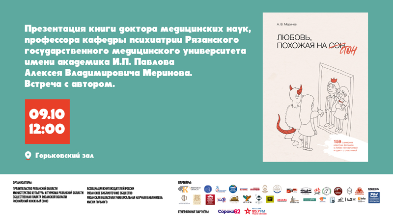 Вышла в свет книга доктора медицинских наук, профессора кафедры психиатрии Рязанского государственного медицинского университета имени И. П. Павлова, практикующего психиатра и психотерапевта Алексея Владимировича Меринова «Любовь, похожая на сон». Это уже вторая книга автора. Новое издание Алексея Владимировича Меринова рассматривает здоровые и нездоровые отношения между людьми, в которых так или иначе прозвучало всем знакомое слово «любовь».