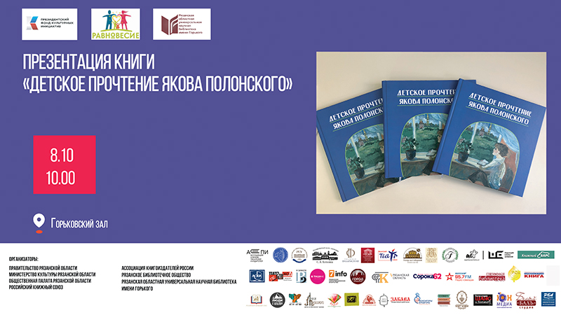 В рамках межрегионального фестиваля национальной книги «Читающий мир» издательство ГБУК РО «Библиотека им. Горького» представляет книгу «Детское прочтение Якова Полонского»», вышедшую в рамках проекта Рязанской региональной общественной организации «Равновесие» благодаря поддержке Президентского фонда культурных инициатив.