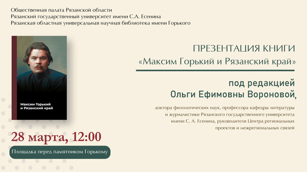 Рязанская областная универсальная научная библиотека имени Горького приглашает читателей на презентацию сборника «Максим Горький и Рязанский край» под редакцией доктора филологических наук, профессора кафедры литературы и журналистики РГУ имени С.А. Есенина, члена Союза писателей России Ольги Ефимовны Вороновой.
