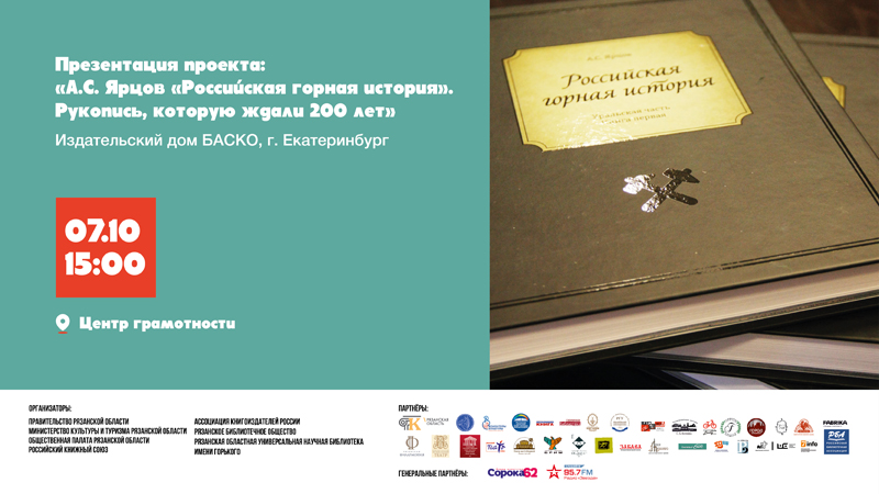 В рамках межрегионального фестиваля национальной книги «Читающий мир» состоится презентация проекта «А.С. Ярцов «Российская горная история». Рукопись, которую ждали 200 лет».
