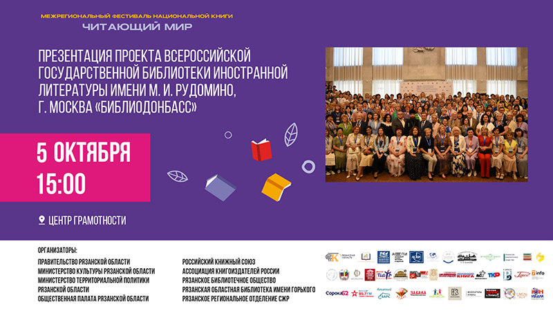 В рамках Межрегионального фестиваля национальной книги «Читающий мир» состоится презентация проекта «БиблиоДонбасс» Всероссийской государственной библиотеки иностранной литературы имени М.И. Рудомино (г. Москва).
