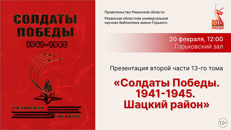 20 февраля в 12:00 в Горьковском зале Рязанской областной универсальной научной библиотеки имени Горького состоится презентация второй части 13-го тома книги «Солдаты Победы. 1941–1945».