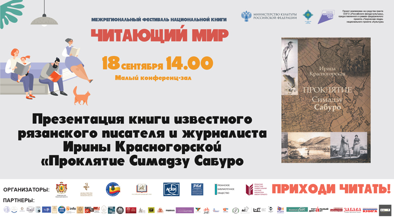 В рамках Межрегионального фестиваля национальной книги «Читающий мир» 18 сентября в 14.00 в малом конференц-зале библиотеки состоится презентация книги известного рязанского писателя и журналиста Ирины Красногорской «Проклятие Симадзу Сабуро», вышедшей в этом году в издательстве «Издатель Ситников».