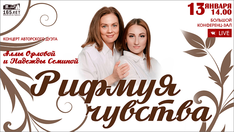 Впервые на сцене библиотеки на очередном заседании клуба будет показана уникальная программа «Рифмуя чувства» авторского дуэта поэтессы Аллы Орловой и певицы Надежды Семиной. Зрителей ждет незабываемый вечер поэзии и авторской песни. Темы встречи – космос, любовь, Родина, семья и дети.