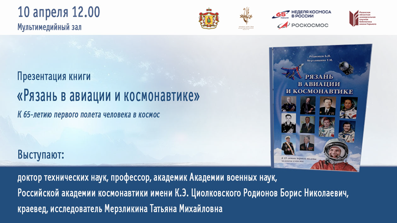 Книга «Рязань в авиации и космонавтике» рассказывает о рязанцах – заслуженных деятелях аэрокосмической отрасли, об их достижениях и роли в процессе создания авиационной и ракетно-космической техники; о научных и производственных предприятиях, учебных заведениях и музеях Рязанской области.
