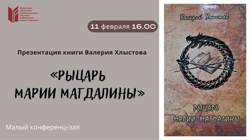 11 февраля в библиотеке состоится презентация книги члена Союза писателей России, поэта и прозаика Валерия Федоровича Хлыстова «Рыцарь Марии Магдалины». Этот приключенческий роман с детективным сюжетом, по словам самого автора, будет интересен молодым людям любого возраста.
