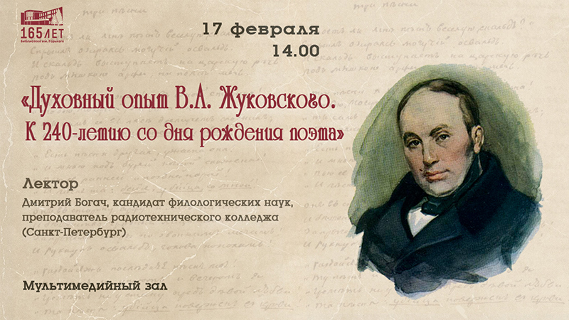 О творчестве Василия Андреевича Жуковского, его человеческих качествах, о том, чем же так располагал он к себе окружающих, вы узнаете, посетив лекцию Дмитрия Богача, кандидата филологических наук, преподавателя радиотехнического колледжа (Санкт-Петербург).
