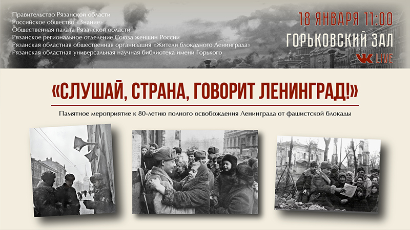 18 января в Рязанской областной универсальной научной библиотеке имени Горького состоится памятное мероприятие «Слушай, страна, говорит Ленинград!», посвященное 80-летию полного освобождения Ленинграда от фашистской блокады.
