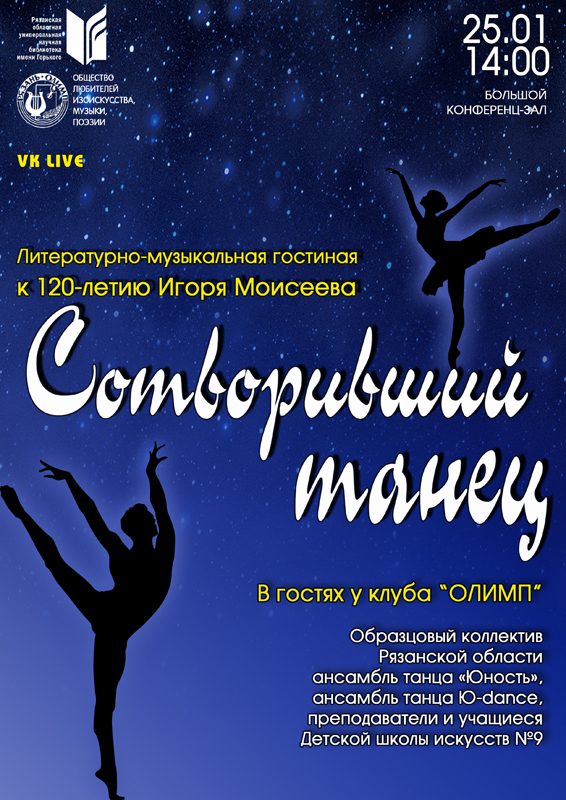 25 января в клубе «ОЛИМП» состоится литературно-музыкальная гостиная «Сотворивший танец», посвященная 120-летию со дня рождения советского и российского артиста балета, танцовщика, хореографа Игоря Александровича Моисеева.