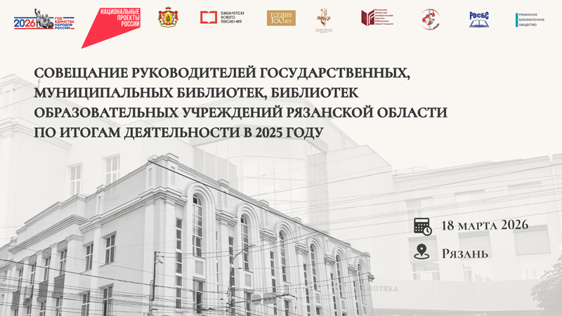 18 марта в 11:00 в Рязанской областной универсальной научной библиотеке имени Горького пройдет совещание руководителей государственных, муниципальных библиотек, библиотек образовательных учреждений Рязанской области по итогам деятельности в 2025 году.