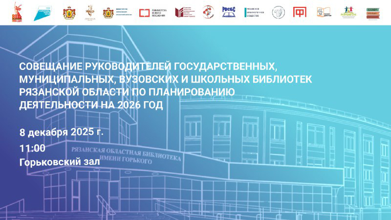 8 декабря 2025 года в 11:00 в Горьковском зале Рязанской областной универсальной научной библиотеки имени Горького состоится совещание руководителей государственных, муниципальных, вузовских и школьных библиотек Рязанской области по планированию деятельности на 2026 год.