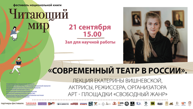 Уважаемые рязанцы и гости города, друзья! Приглашаем вас на лекцию «Современный театр в России» Екатерины Вишневской, актрисы, режиссера, один из организаторов арт-площадки «Свободный жанр», один из создателей проекта Рязанского театра драмы «Школа уличного театра #Jija», режиссёр уличного спектакля «Что угодно».