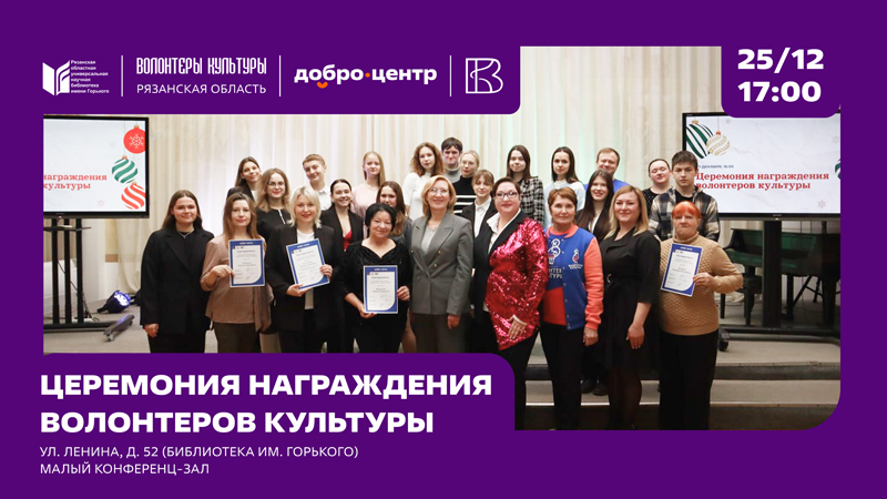 Церемония награждения волонтеров культуры Рязанской области состоится 25 декабря в 17:00 в малом конференц-зале библиотеки имени Горького.