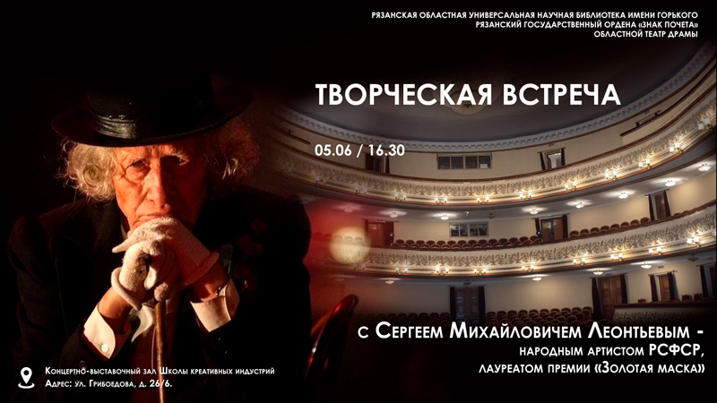 5 июня в 16:30 в концертно-выставочном зале Рязанской областной библиотеки имени Горького (ул. Грибоедова, 26/6) в рамках этого проекта состоится творческая встреча с народным артистом РСФСР, лауреатом премии «Золотая маска» Сергеем Михайловичем Леонтьевым (род. в 1939 году) — человеком, чья жизнь неразрывно связана с историей отечественного театра, посвятившим свою жизнь служению театру, зрителям, своим почитателям.