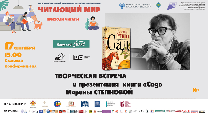 В рамках Межрегионального фестиваля национальной книги «Читающий мир» состоится встреча с российским писателем Мариной Степновой и презентация ее книги «Сад».
