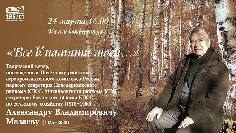 В малом конференц-зале состоится творческий вечер, посвященный почётному работнику агропромышленного комплекса России, первому секретарю Новодеревенского райкома КПСС, Михайловского райкома КПСС, секретарю Рязанского обкома КПСС по сельскому хозяйству (1976–1986) Александру Владимировичу Мазаеву (1935–2020).