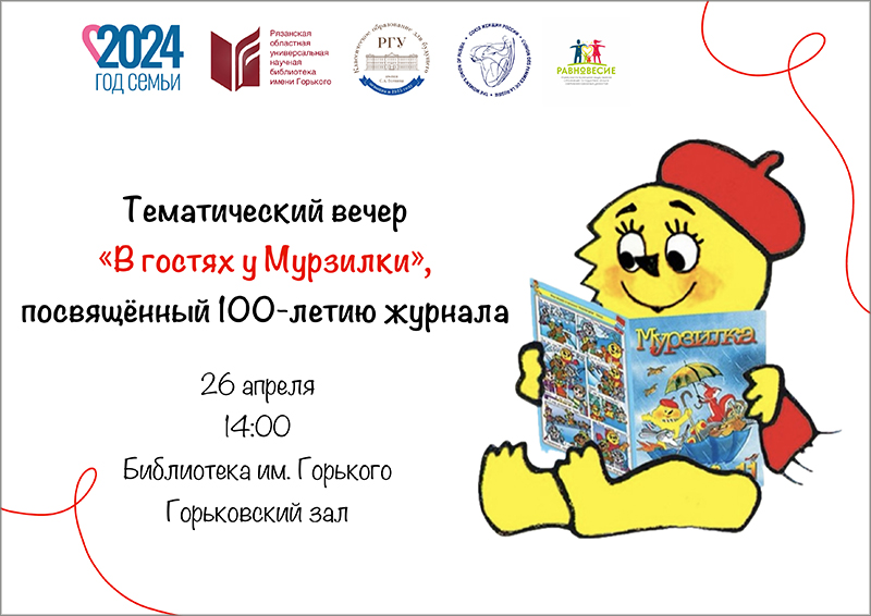 В преддверии юбилея приглашаем всех желающих посетить тематический вечер, посвященный истории журнала «Мурзилка». Мероприятие состоится 26 апреля в 14:00 в Рязанской областной универсальной научной библиотеке имени Горького.