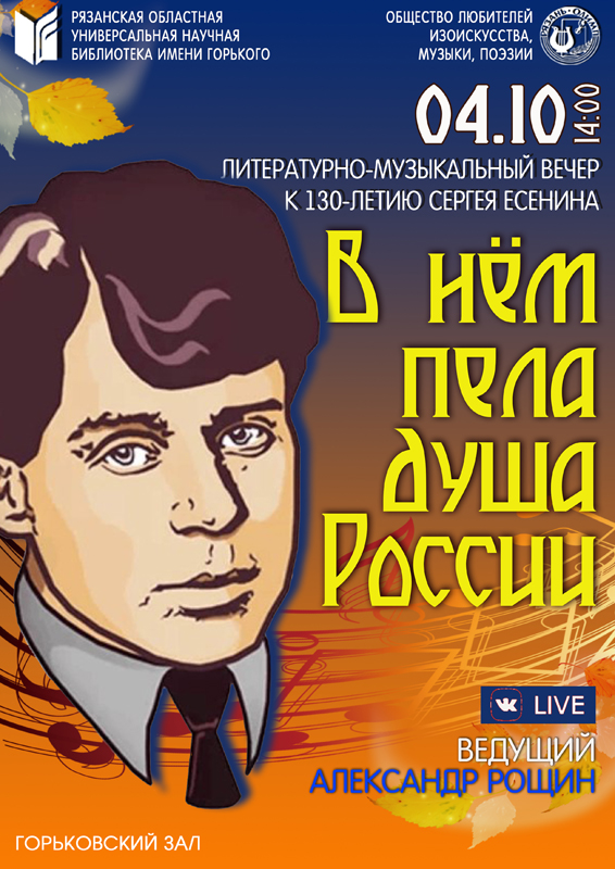 Горьковский залВ клубе «ОЛИМП» состоится литературно-музыкальный вечер «В нем пела душа России», посвященный 130-летию со дня рождения русского поэта, нашего земляка Сергея Александровича Есенина.