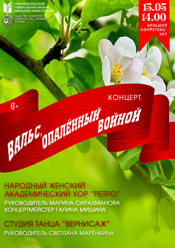 15 мая в клубе «ОЛИМП» пройдет концерт «Вальс, опаленный войной» одного из лучших творческих коллективов Рязани – народного коллектива любительского творчества Рязанской области женского академического хора «РЕТРО» ДК «Приокский». Художественный руководитель – Марина Сарахманова, концертмейстер – Галина Мишина. Концерт посвящен 77-й годовщине Победы в Великой Отечественной войне 1941–1945 годов.
