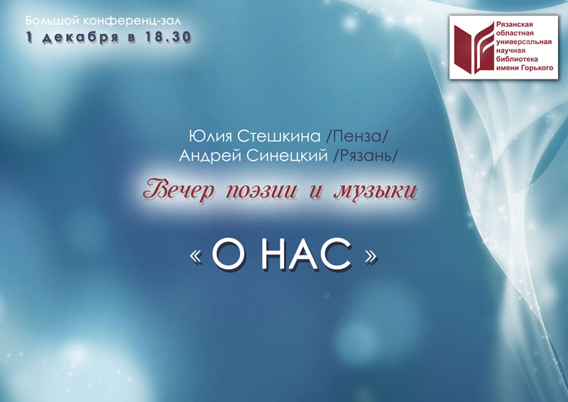 1 декабря в 18.30 в большом конференц-зале Рязанской областной библиотеки имени Горького состоится творческий вечер молодой поэтессы Юлии Стешкиной и талантливого рязанского пианиста Андрея Синецкого – «О нас».