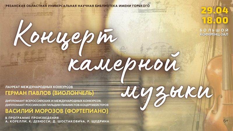 29 апреля библиотека встретит своих читателей и гостей шедеврами виолончельной музыки в исполнении заслуженного деятеля искусств республики Куба, лауреата международных конкурсов Германа Васильевича Павлова и лауреата всероссийских и международных конкурсов, дипломанта Российской Гильдии пианистов-концертмейстеров Василия Сергеевича Морозова.