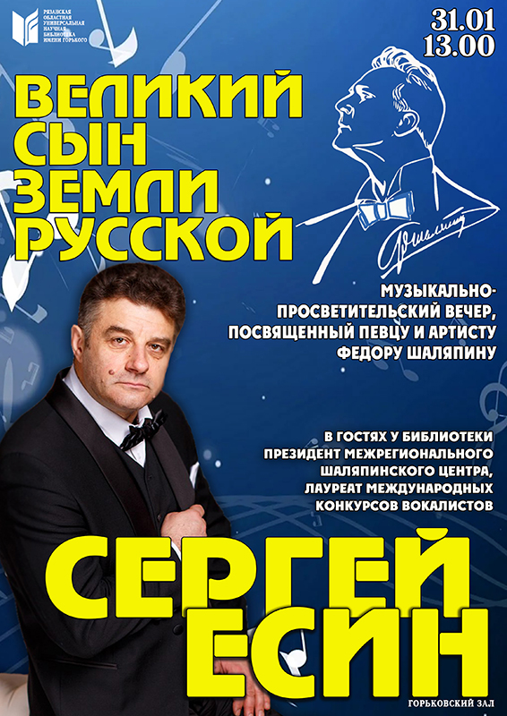 31 января в библиотеке имени Горького состоится музыкально-просветительский вечер, посвященный певцу и артисту Федору Ивановичу Шаляпину.