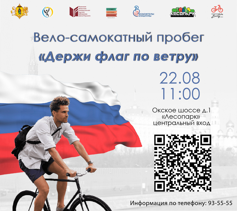 22 августа в 11:00 в рамках Всероссийской патриотической акции «Держи флаг по ветру», посвященной 30-летию Государственного Флага Российской Федерации, в лесопарке г. Рязани состоится вело-самокатный пробег.