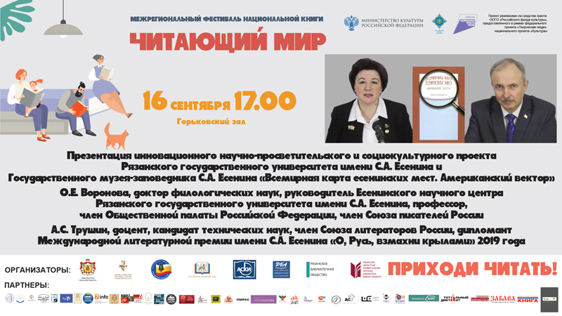 16 сентября в 17.00 в Горьковском зале библиотеки в рамках фестиваля «Читающий мир» состоится презентация инновационного научно-просветительского проекта члена Комиссии по культуре Общественной палаты РФ, руководителя Есенинского научного центра, доктора филологических наук, профессора РГУ имени С.А. Есенина, главного редактора журнала «Современное есениноведение», члена Союза литераторов России Ольги Вороновой и доцента, кандидата технических наук, члена Союза литераторов России Александра Трушина «Всемирная карта есенинских мест. Американский вектор».