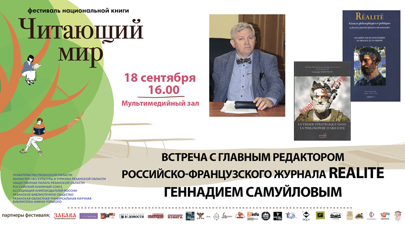 Мультимедийный залВ дни фестиваля в библиотеке пройдет встреча с главным редактором российско-французского журнала Réalité, доцентом Московского государственного лингвистического университета Геннадием Самуйловым. Издание посвящено лингвистическим, социально-политическим, философским исследованиям российских и французских вузов. Соиздателем журнала с российской стороны выступает Московский государственный лингвистический университет.