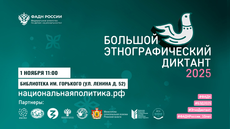 Для очного участия в «Большом этнографическом диктанте» приглашаем всех желающих 1 ноября в 11:00 на площадку в Рязанской областной универсальной научной библиотеке имени Горького по адресу: г. Рязань, ул. Ленина, д. 52.