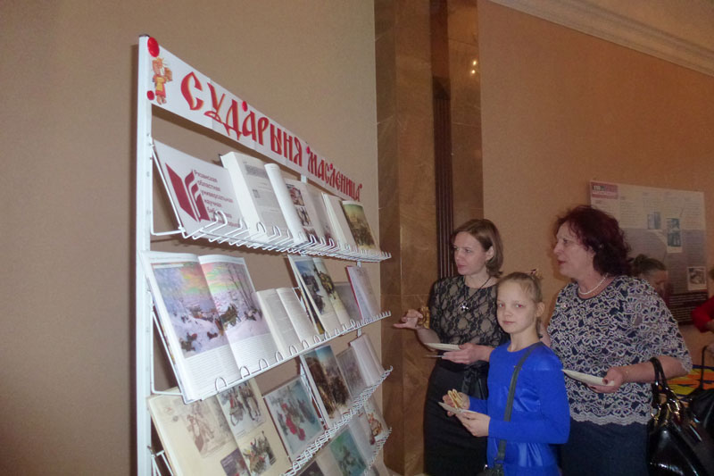 Присоединилась к праздничным мероприятиям и Рязанская областная библиотека имени Горького. В фойе филармонии работала книжно-иллюстративная выставка «Сударыня Масленица», и каждый желающий мог стать участником познавательной викторины «Блин кушай, а вопрос слушай». Отвечать на вопросы хотели многие, ведь за каждый правильный ответ участник награждался главным символом Масленицы – ароматным блином.